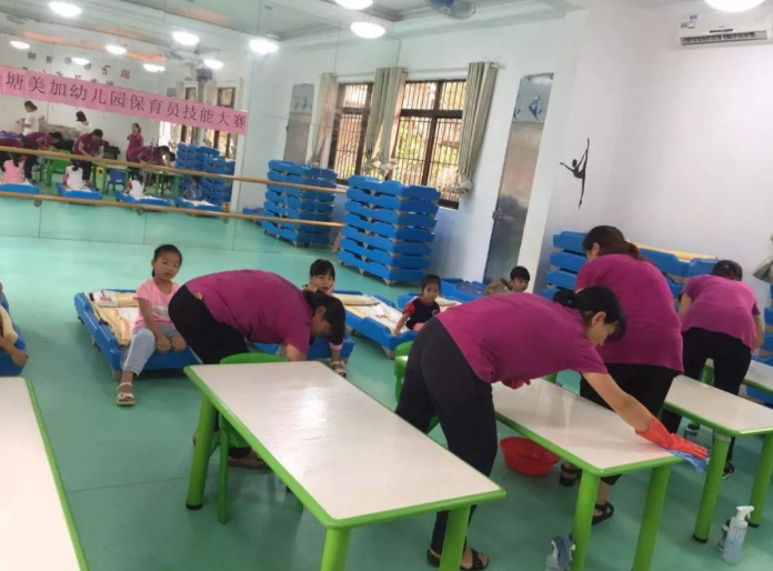 3、 湿扫湿抹。先用清水将窗沿,桌面,玩具柜擦一遍,然后再用消毒液擦一遍,地面,走廊拖一遍。