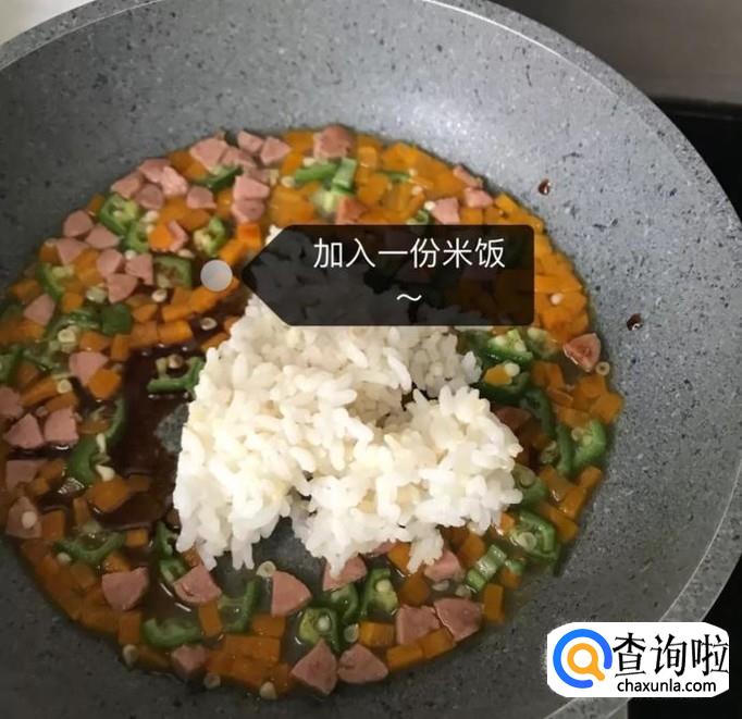 然后往锅中加入一碗米饭,如图所示。