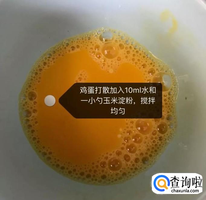 然后在一个碗中打入一颗鸡蛋,加入十毫升的水和一小勺的玉米淀粉,搅拌均匀,如图所示。