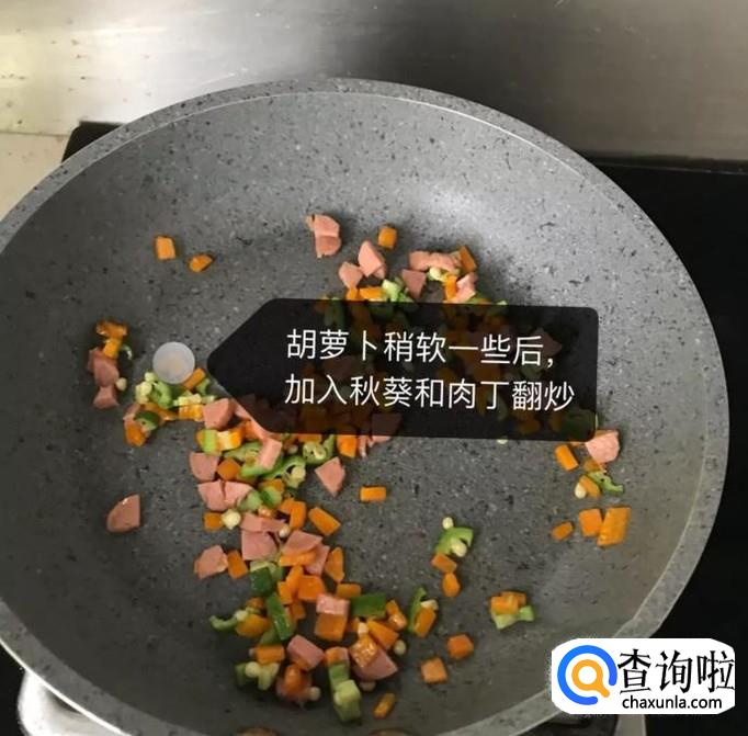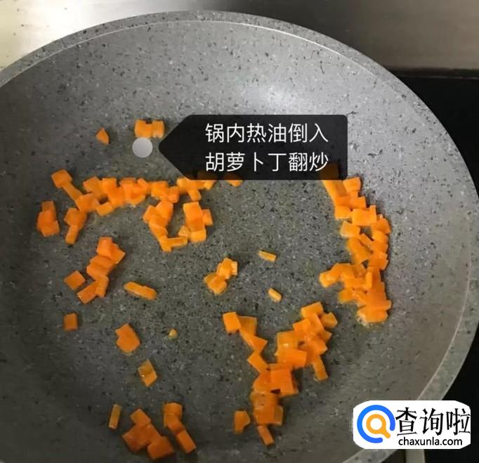 然后锅中放入适量的食用油,待油冒烟,倒入胡萝卜丁翻炒两分钟,如图所示。