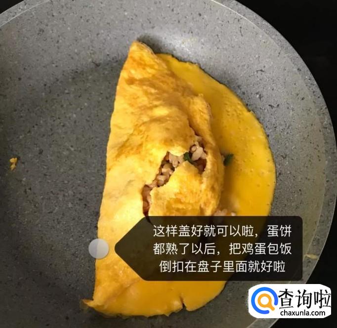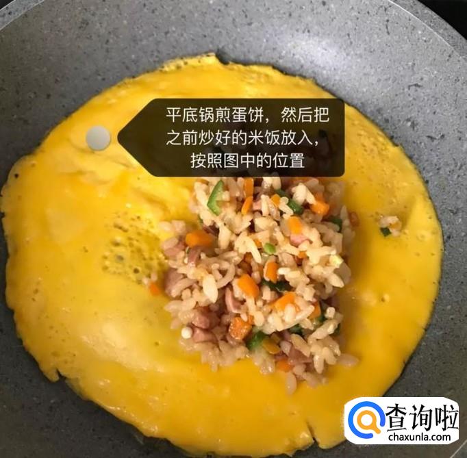 接着锅中放入适量的食用油,倒入平底锅煎蛋饼,之后把之前炒好的米饭倒在蛋饼的上方,如图所示。