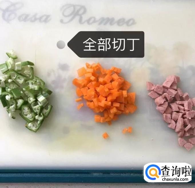 首先将秋葵、胡萝卜和肉都切成丁,如图所示。