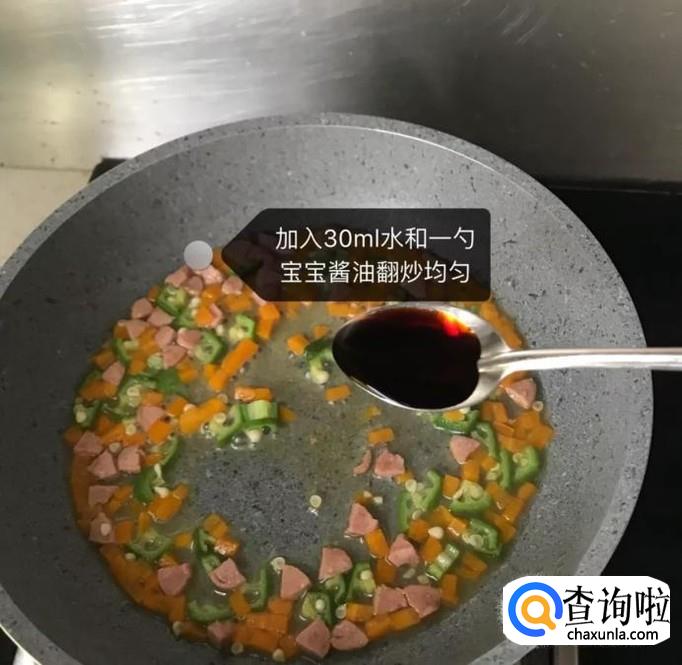 接着加入30ml的清水和一勺的酱油翻炒均匀,如图所示。小贴士:如果大家是做给宝宝吃的,可以用等量的宝宝酱油替换酱油。