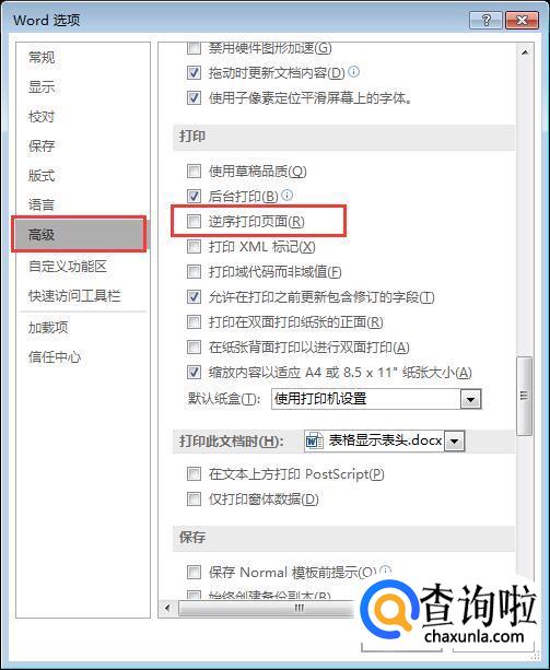 逆序打印一般我们打印出来的纸张需要重新手动调整顺序,但是如果设置成逆序打印的话,就不会那么麻烦,打印出来后就是按照文档的顺序。如何设置呢?进入【文件】-【选项】-【高级】,在打印那边设置,勾选【逆序打印页面】。