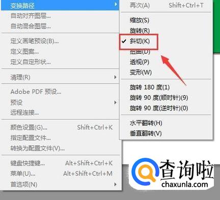 选正方形按下Ctrl+T键,然后在编辑菜单里找到变形点里的斜切选项,如图所示:
