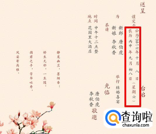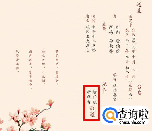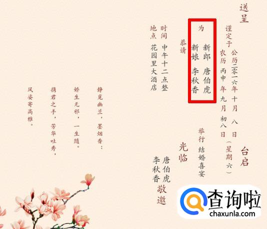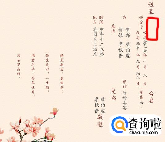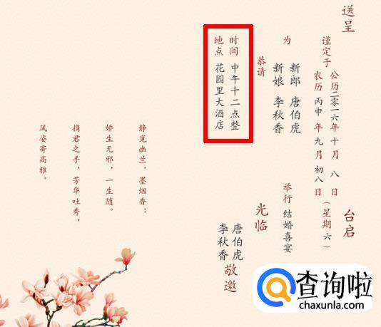 再将婚庆的时间地点写上,标明几点几分,地点也要详细,不然找不到就尴尬了。