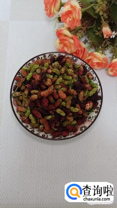 准备新鲜的桑葚,加入适量盐,淘洗干净,去除果柄,控干水分,放入盘中备用。