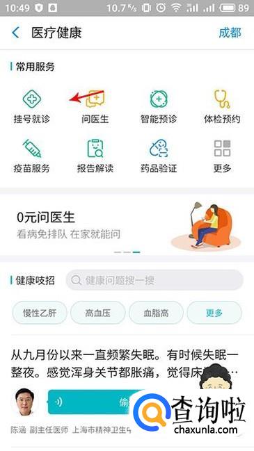 进入医疗健康界面,在常用服务中点击“挂号就诊”进入。