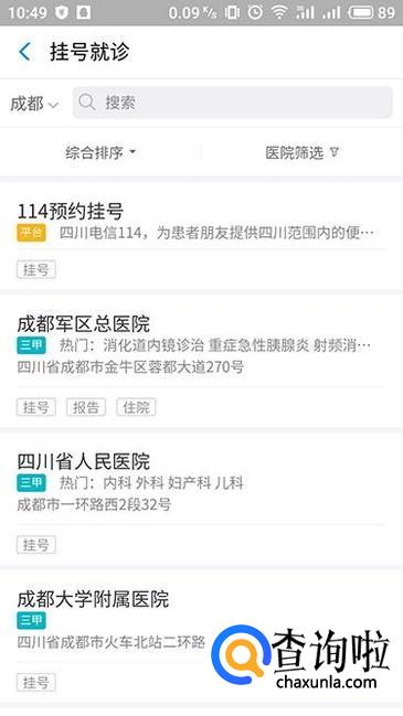进入挂号就诊界面,在上方选择相应的城市,然后在下方选择需要进行预约的医院进入。