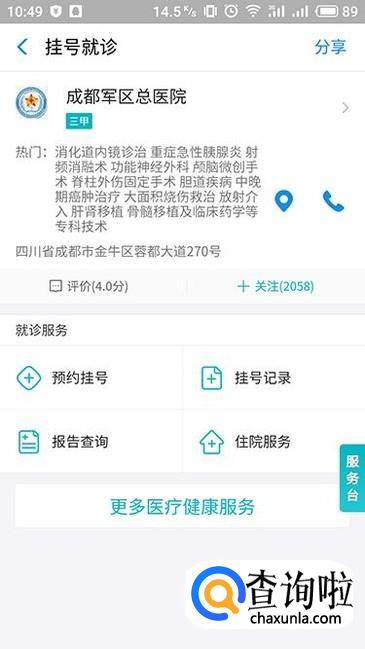 点击医院之后查看医院详情,能够看到地址信息以及热门科室等,在就诊服务中选择“预约挂号”