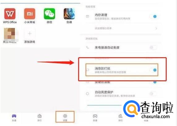 打开安全中心—游戏加速,点击右下角“设置”,找到并开启“消息防打扰”。