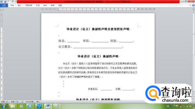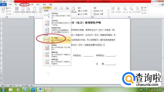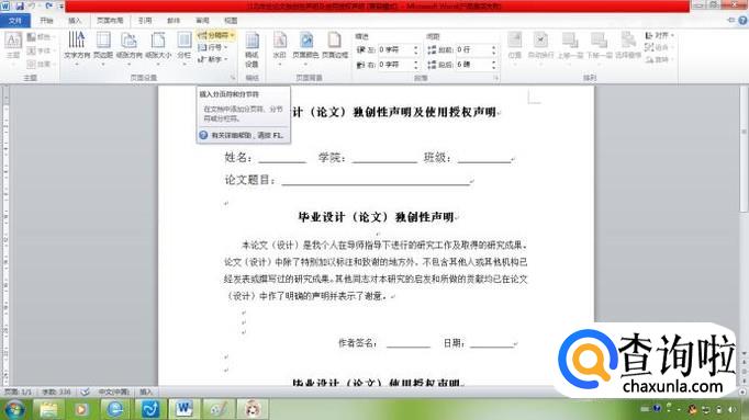 将光标放到“保密的论文(设计)在解密后遵守此规定。”的后面,按下enter键,便插入了一个下一页分节符,效果如下