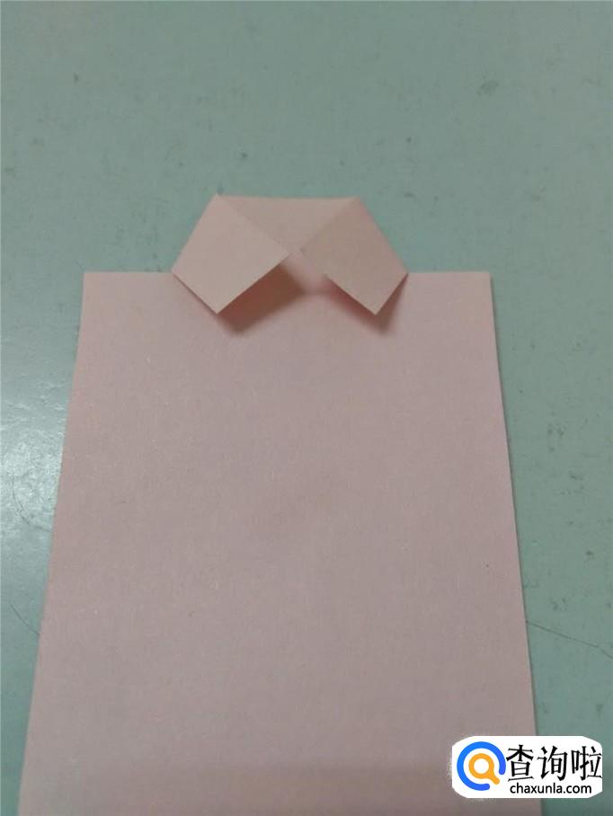 把左右两个纸条往中间折,折成如下的形状,表示领子。