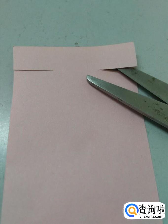 用剪刀在彩色卡纸上方的左右两端剪两个口子,只留中间三分之一处不剪。