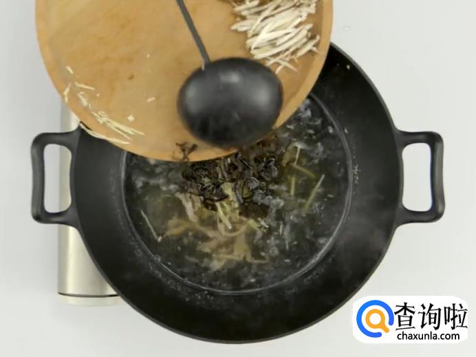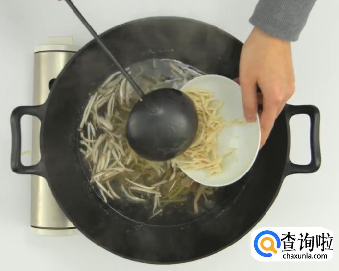 下瘦肉丝煮沸,撇去浮沫。
