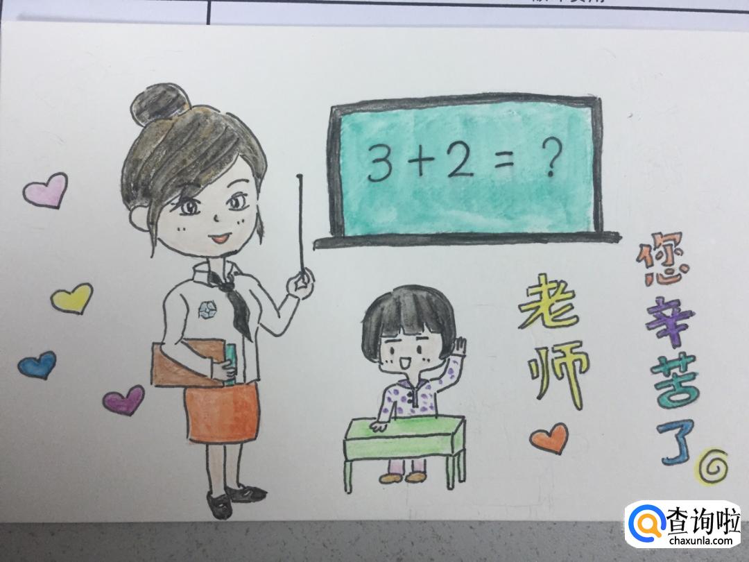 老师教学。画一个老师正在教学黑板上的内容,画一个学生正在认真听讲并思考,画几颗桃心,写上老师您辛苦了。