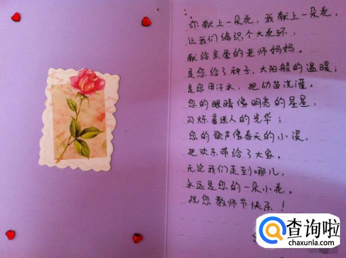 真诚的祝福。将贺卡一边贴上花朵和桃心,另外一边写上祝福语,写上自己真诚的话语。