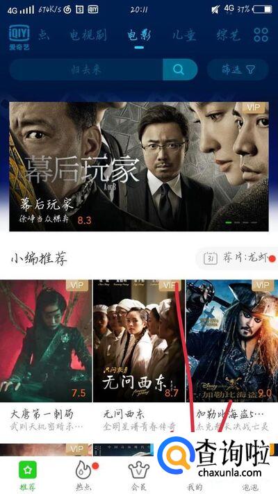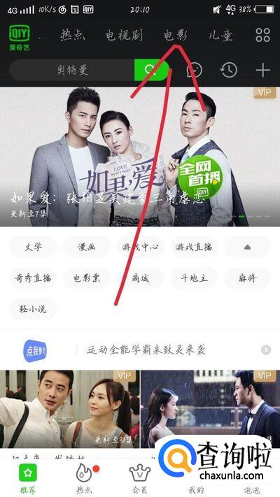 首先打开爱奇艺这个软件,如图1所示。会进入一个新的界面,如图2所示。在最上方找到电影这个选项,点击。如图3箭头所示。