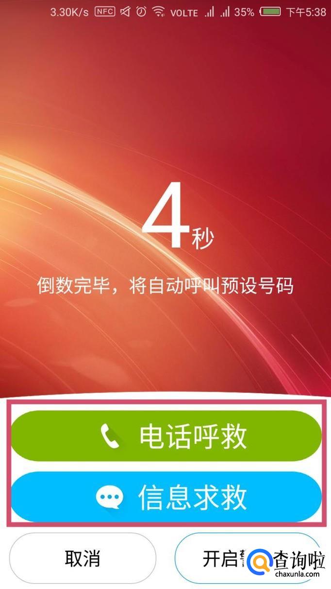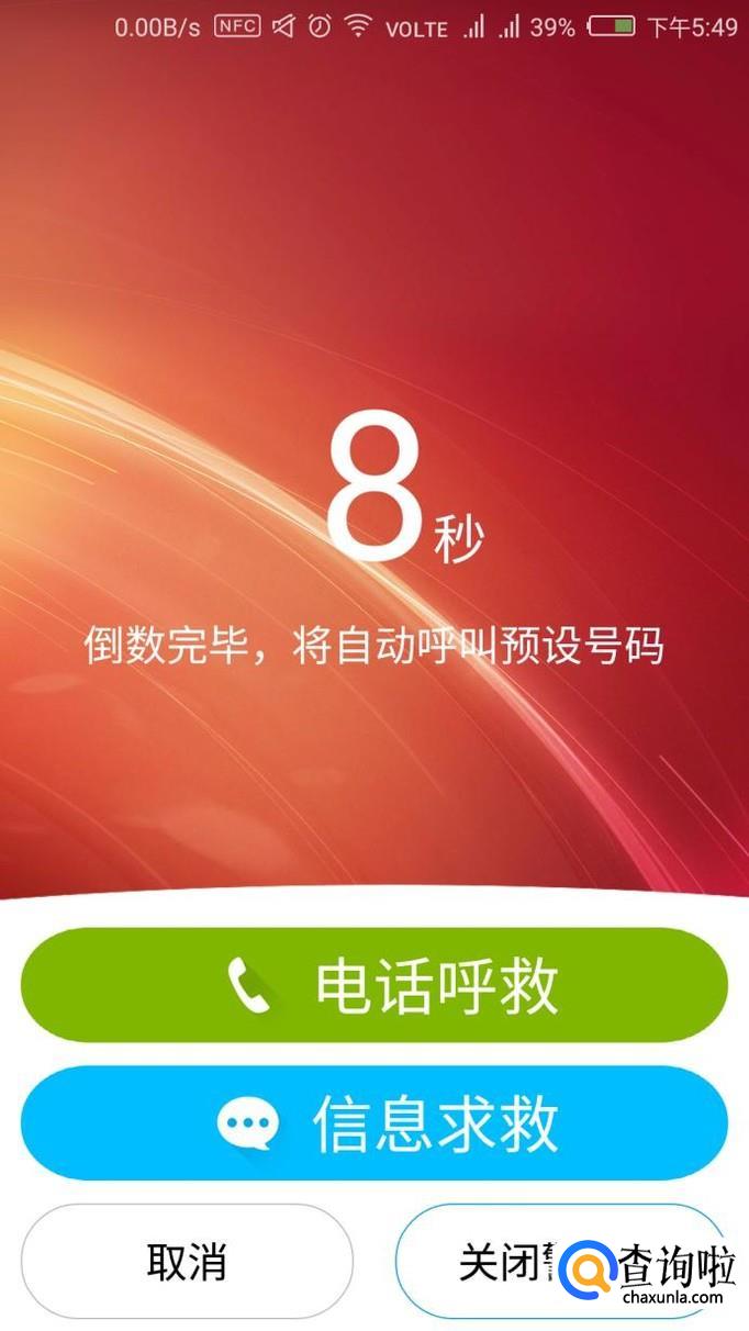 上方有两个选项卡,分别是【电话求救】和【信息求救】,点击【电话求救】后手机会自动给预设号码打电话;点击【信息求救】后手机会按照预设【救援信息内容】给预设号码发短信。