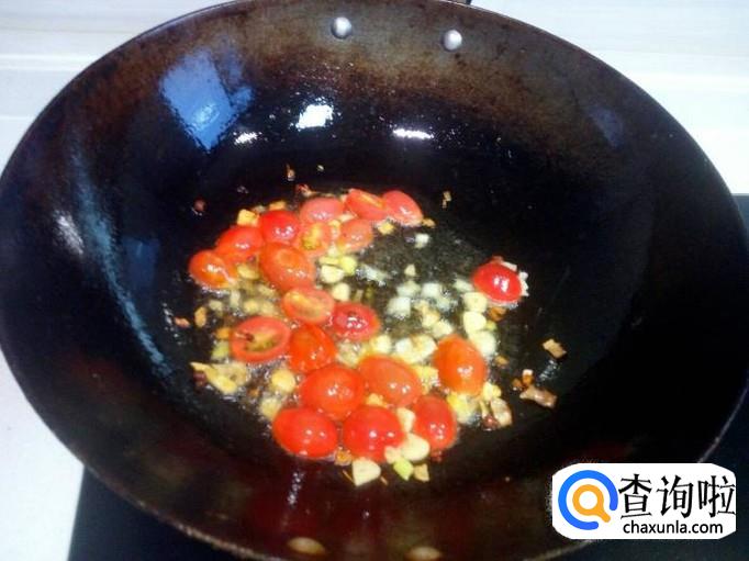 锅内放入油加热,油热后放入花椒,葱,姜,蒜,爆锅,随即放入小柿子翻炒。