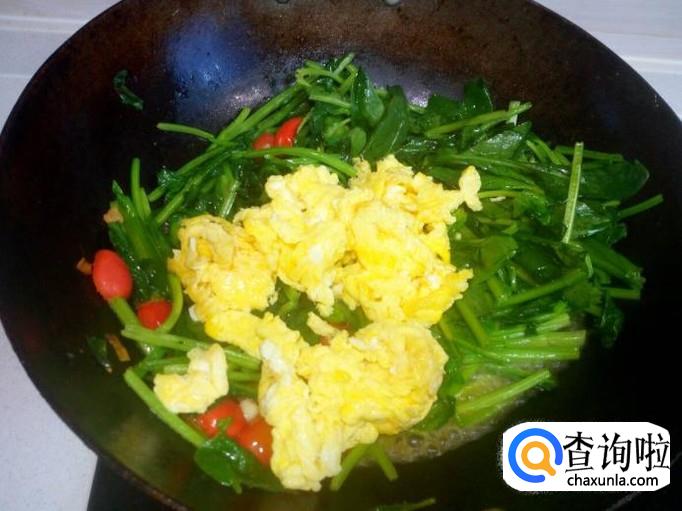 菠菜炒至断生,放入炒好的鸡蛋,颠勺翻下个,放入味精,关火出勺。