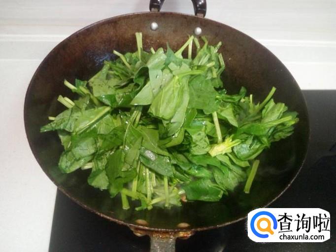 小柿子不要炒火大,略翻炒一下即可,然后放入菠菜,大火爆炒,放入盐。