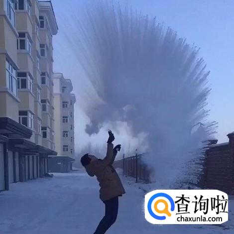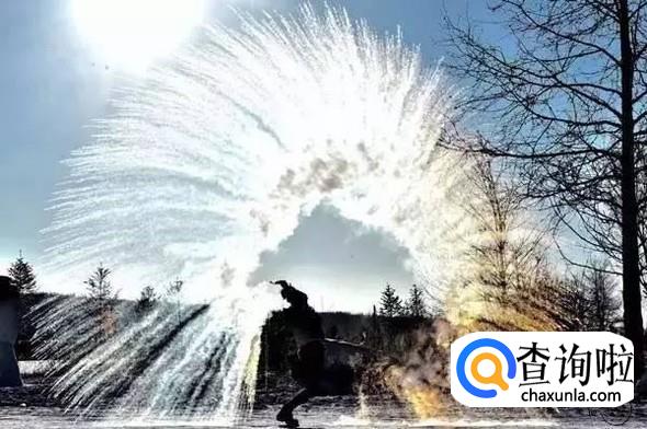 由于开水突然接触超低温度,就会形成冰,也就形成了视频中看到的美丽画面。