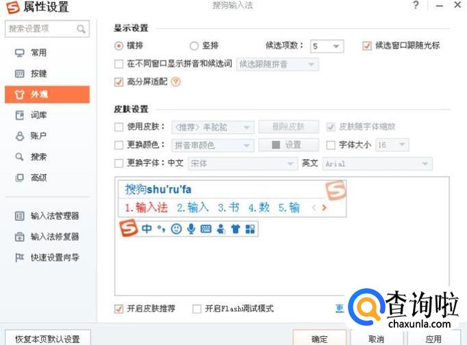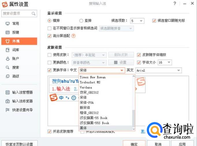 点击“外观”,显示的是输入字体等外观的设置,可以设置字体,文字大小等。