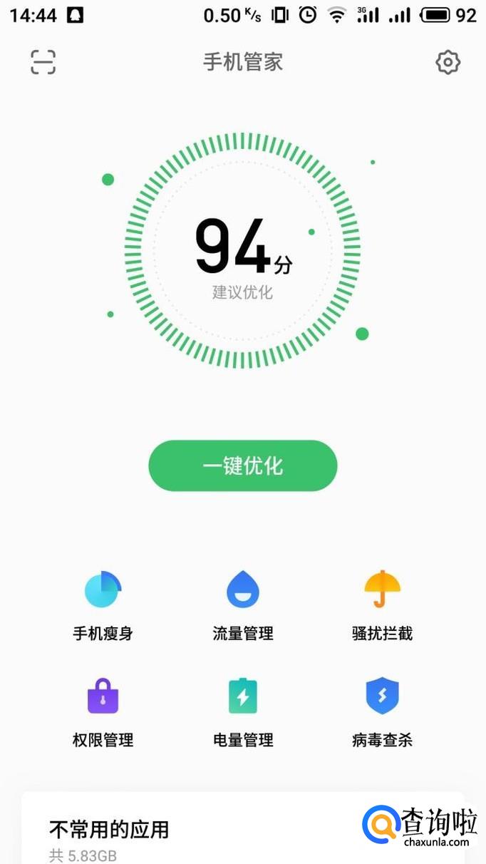 打开手机进入主界面,然后进入手机自带的“手机管家”,点击“一键优化”