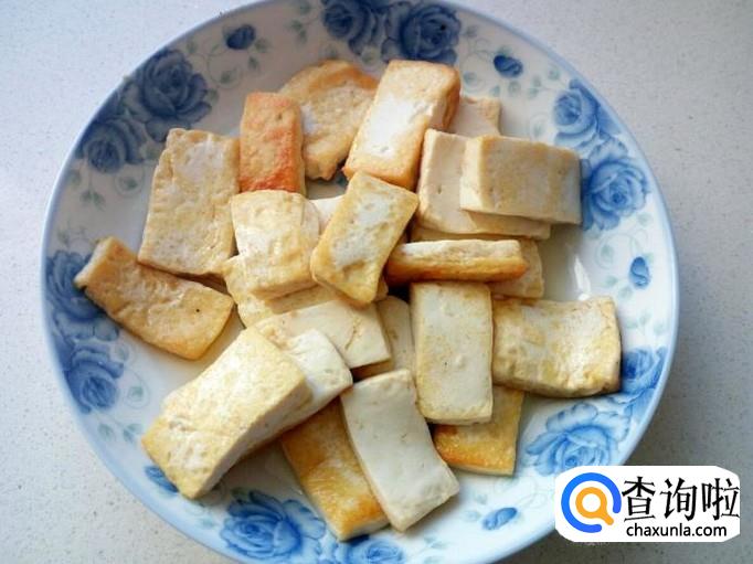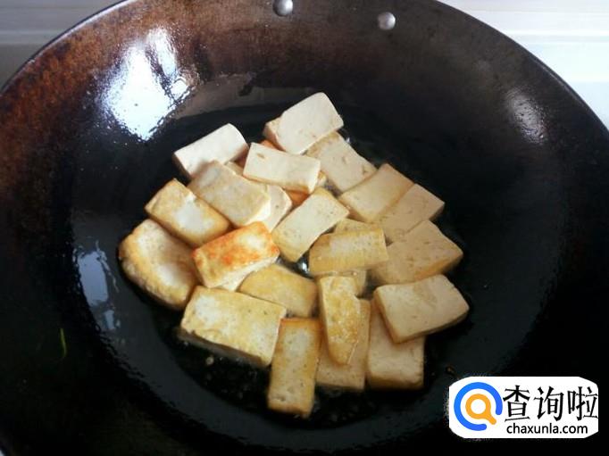 锅内放入油加热,油热后放入豆腐小火煎塌,晃动锅翻面,不要用铲刀,避免铲破豆腐。煎塌至豆腐两面微黄,盛出备用。