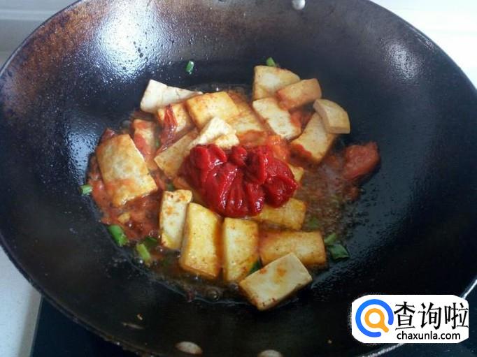 随即放入豆腐,颠勺翻个。然后放入番茄酱。