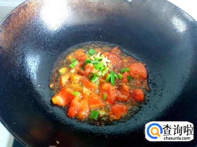 锅内重新放油加热(如果塌豆腐有剩余油,用塌豆腐的油即可),油热后放入西红柿翻炒,炒至西红柿变软,下汤汁(西红柿要炒软些,接近成泥状),然后放入葱,姜,五香粉,白糖,少许盐翻炒。