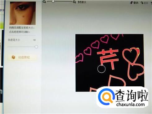 选择祛痘祛斑功能后,将左面的祛痘笔大小调整到自己想要的大小,然后将光标放在图片中的字上面,点击一下之后,芹字左下角的撇就不见了。