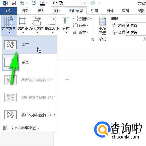 在下面展开的各个功能组中,鼠标再点击文字方向按钮,弹出下拉菜单再点:水平