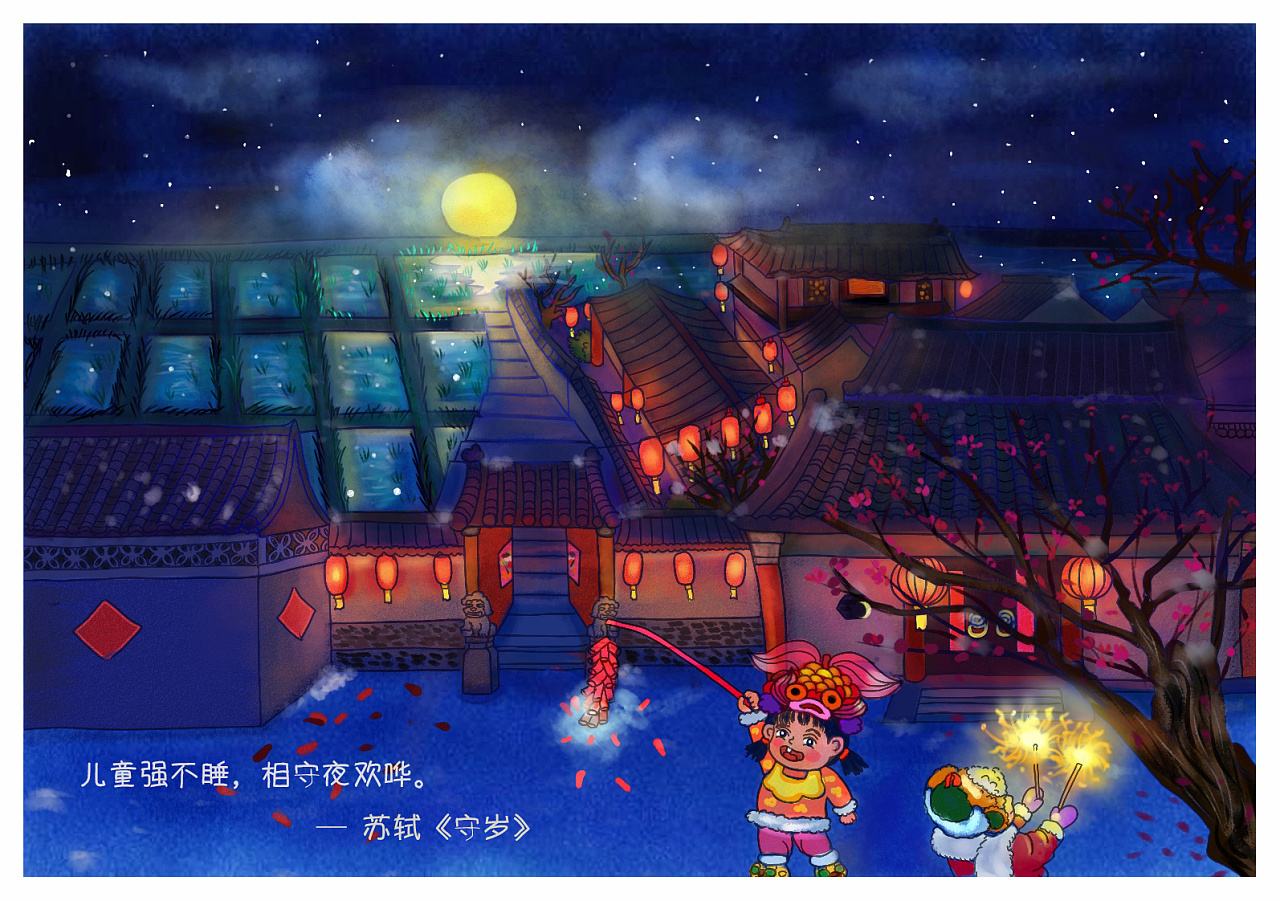 其次,守岁还有一种说法是年轻人为父母长辈守岁,为父母长辈延年益寿;守岁的“守”,即有对即将逝去的旧岁有留恋之情,也有对即将到来的新年怀希望之意。