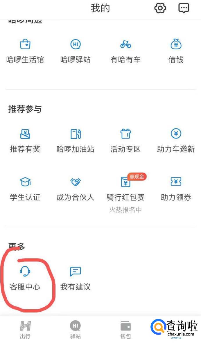 记住时间和日期过后,返回至哈罗出行的首页,点击“我的”进入个人中心页面,下拉在“更多”选项里找到“客服中心”并点击进入。