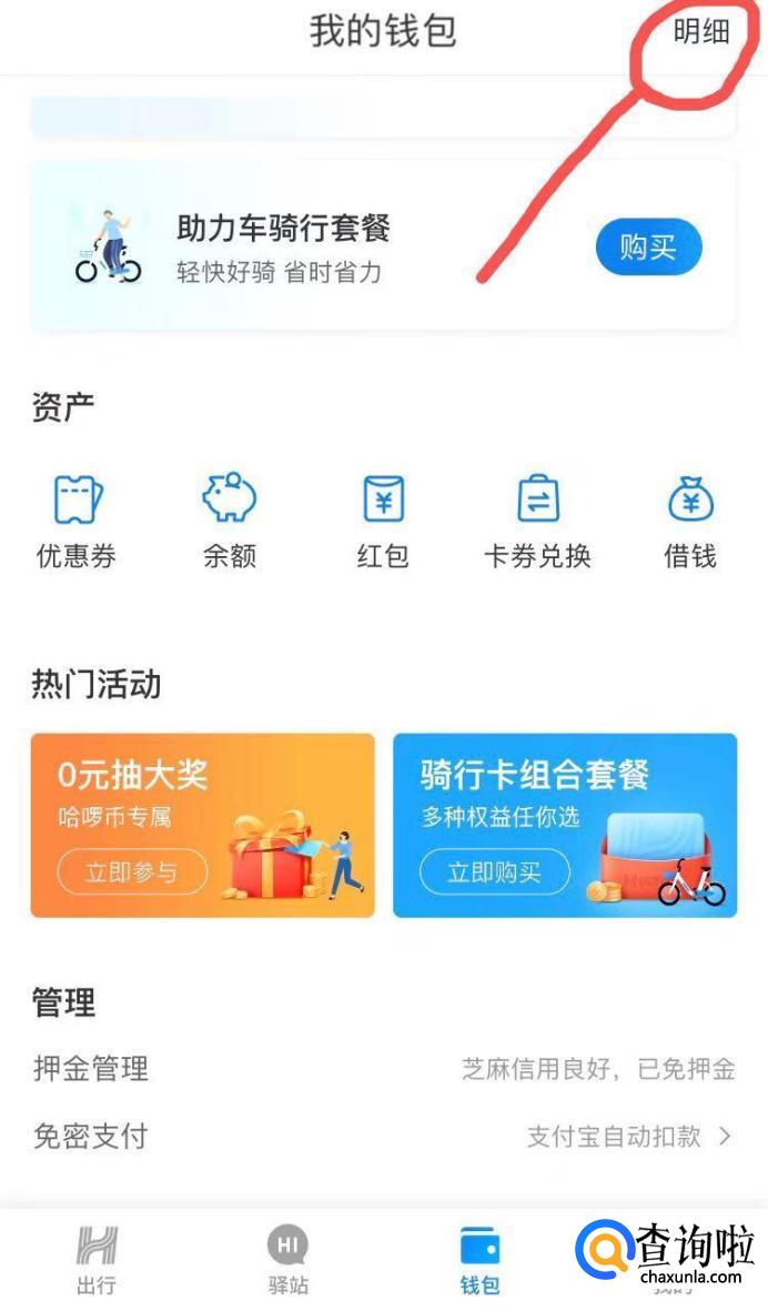 点击进入后,选择页面中的“余额明细”,查找自己的骑行记录中不正常的订单,并且记住此订单的日期和时间。