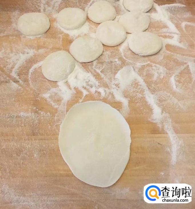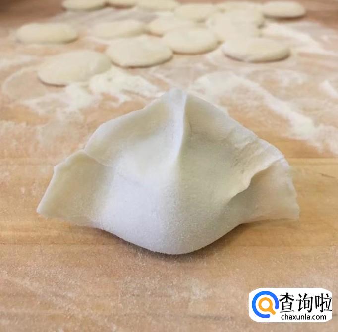 案板铺撒干面粉取一小块醒好的面团搓成长条揪成大小均匀的小面团搓圆按扁成擀成饺子皮放入足足的馅料,对折后捏紧包成饺子