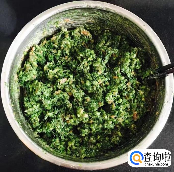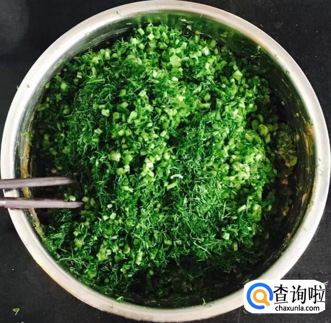 茴香菜择洗干净并控干水分后切成碎末,放入腌制肉馅的容器中搅拌均匀即可