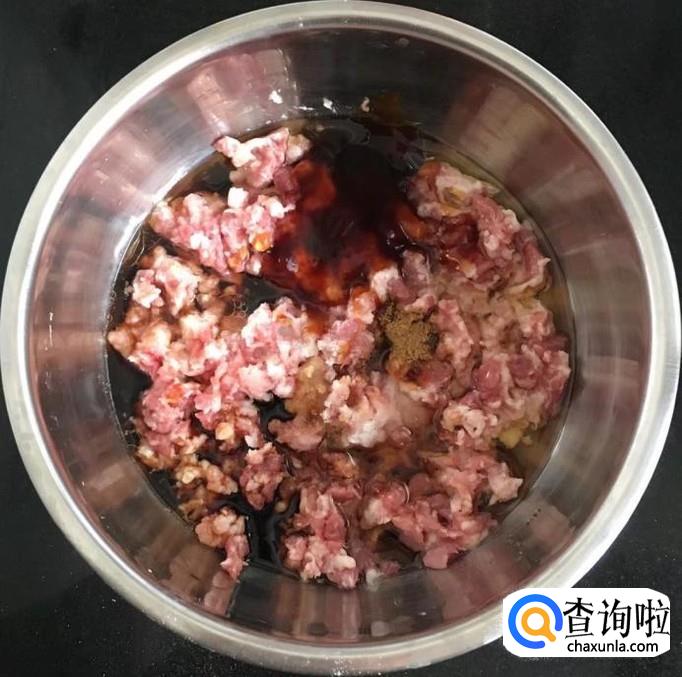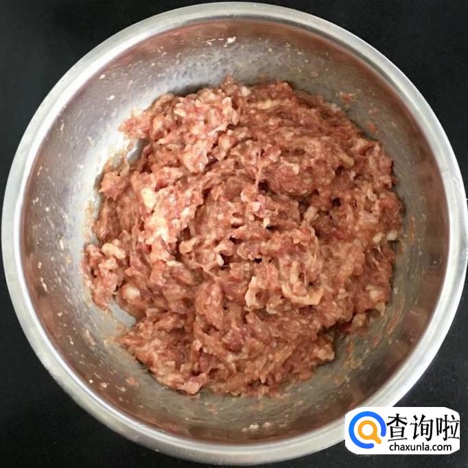 肥瘦相间的猪肘肉绞成肉泥放入容器中,加入适量的花生油、料酒、香油、蚝油、味极鲜酱油、十三香、葱、姜末搅拌均匀腌制入味儿