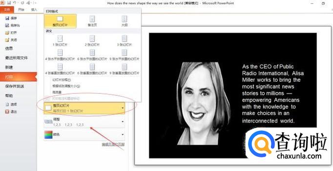 点击“整页幻灯片”处可以选择一页A4纸上打印幻灯片数。
