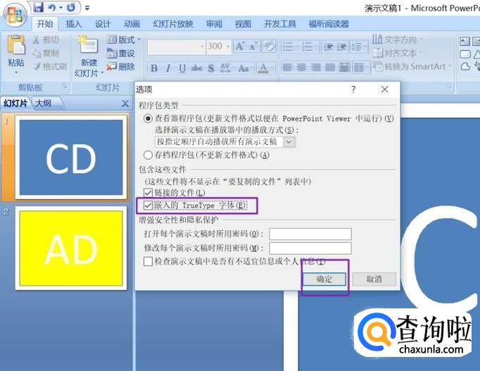 弹出的界面将嵌入的TrueType字体勾选上,然后点击确定;