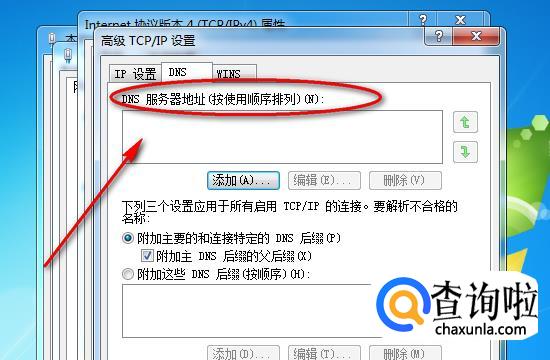 最后会弹出一个“高级 TCP/IP设置”窗口,将DNS服务器地址下方框里的项目删除,点击确定即可。