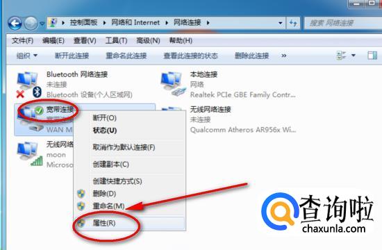 右击“宽带连接”,会弹出一个菜单,点击“属性”。