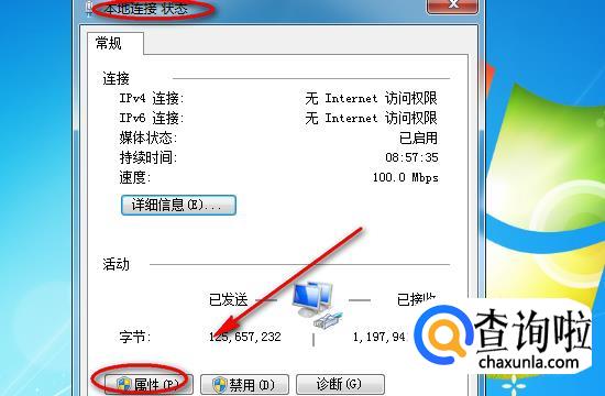 会弹出一个“本地连接 状态”窗口,点击下方的“属性”按钮。