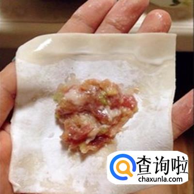 馄饨皮加入馅料,用筷子在最顶端抹清水。