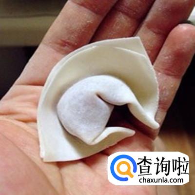把馄饨皮的两个角叠合,捏紧成如图所示模样就可以了。