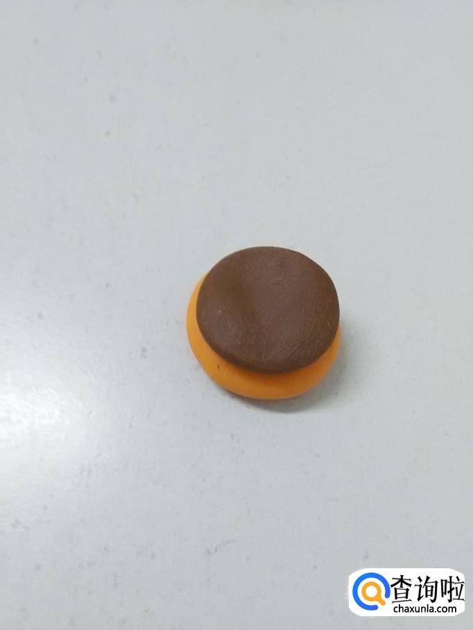 用棕色团一个圆球,也按成圆片,粘在面包上,当作牛肉饼。