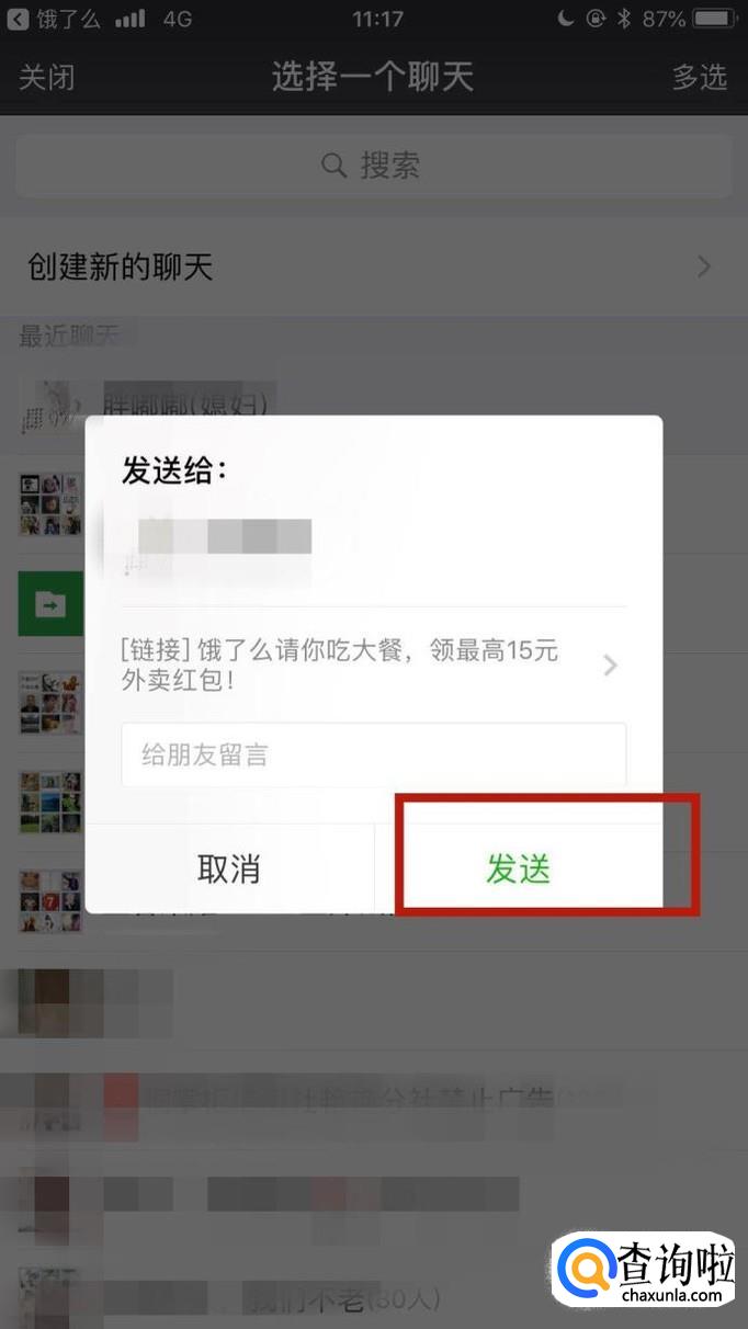 然后选择一个好友,并点击发送。只要好友成功加入了饿了么,你就可以获得现金红包了。