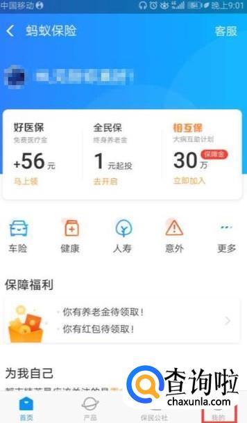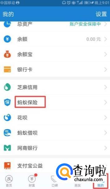 首先,我们打开我们的手机,然后我们打开我们手机上的支付宝,之后我们点击我的,然后我们点击蚂蚁保险;